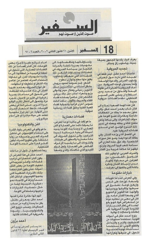 ونحن في مراسم وداع الحروفية كمدرسة صافية من المدارس التشكيلية التي أفلت او في طريقها الى الافول، يستوقفنا الفنان احمد عقل بمعرضه الذي افتتح أمس الأول في قصر الاونيسكو ببيروت، وينبهنا الى ان ثمة إنجازات يمكن ان تحدث على مستوى الحروفية العربية، من خلال الاستعانة بوسيلة تشكيلية جديدة هي الكومبيوتر. محطة احمد عقل كانت محطات، فهو، اولا، حوّل افتتاح معرضه الى ما يشبه المهرجان الذي حضره عدد كبير من الفنانين والمثقفين والمهتمين، وعمل فيه على حشد وسائل إعلامية متنوعة بما في ذلك عدد لا بأس به من الفضائيات العربية. وهو، ثانيا، قدم في الافتتاح عرض فيديو، يوالف فيه بين بنائية الحرف العربي في لوحاته وبنائية موسيقى جمال ابو الحسن، في خطوة مبتكرة لافتتاح معرض تشكيلي. وهو، ثالثا، فاجأنا في معرض هو الاول في تجربته، ليقدم عدداً كبيراً من الاعمال التي استطاع، من خلالها، ان يميز تجربته، ويضعها على سكة الاحتراف. في ذلك كله، بدا احمد عقل لاعباً وفناناً في آن. يقدم لوحة متمكنة، ويعرف كيف يعلن ويروّج لها، بل يعرف كيف يقدمها للجمهور بصيغة جميلة، وبأسلوب راق ومبتكر.